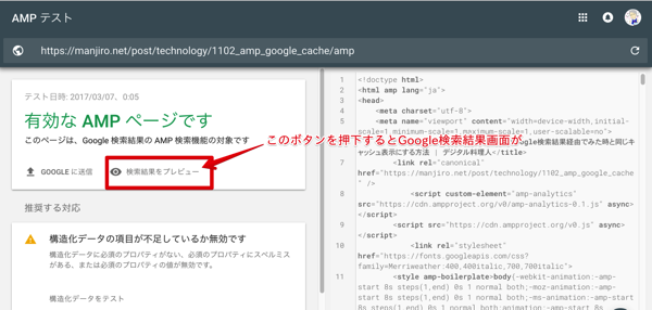 Google からの流入も再現したい場合は、Search Consoleにある AMPテストという機能を使ってAMPページのValidationをした後に出て来る「検索結果のプレビュー」ボタンで生成されるURLを使うとテストできます。